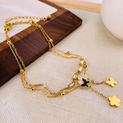 OPK GZ192 Einfache, zarte Fußkettchen aus Edelstahl mit Quaste, Schmetterling und Blume, doppellagig
