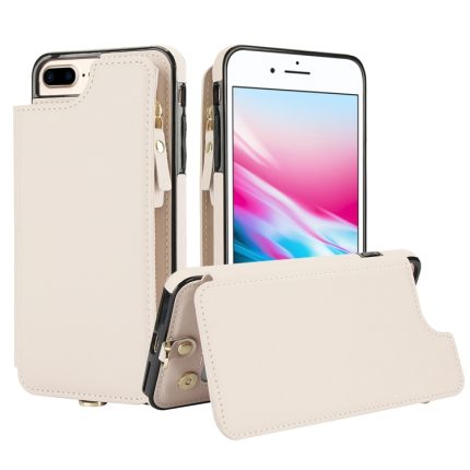 RFID-Telefonhülle aus Leder mit doppeltem Reißverschluss und kurzem Umhängeband, For iPhone 8 Plus / 7 Plus