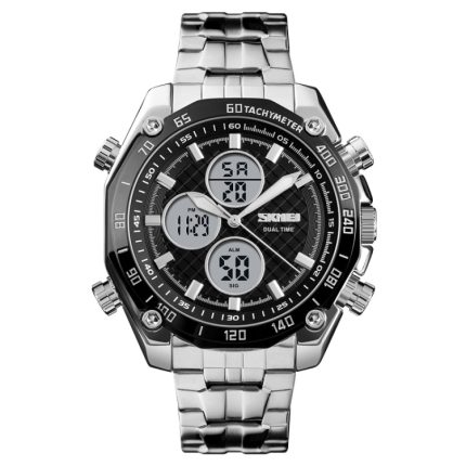 SKMEI 1302 Fashion Herren Freizeit-Armbanduhr, multifunktionale Dual-Time-Sport-Digitaluhr mit Edelstahl-Armband, 30 m wasserdicht