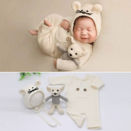 Neugeborenen-Fotografie-Kleidung, Baby-Strickoverall + Mütze + Mäusepuppe, dreiteiliges Set, Mouse Doll Set(White), Mouse Doll Set (Pink), Mouse Doll Set (Grey), Mouse Doll Set (Brown)
