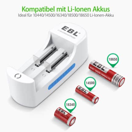 Ursprünglicher Preis war: CHF 44.70CHF 34.90Aktueller Preis ist: CHF 34.90.pro StückEBL universal Ladegerät für 2 Akkus vom Typ 16340 / 14500 / 10440 / 18500 / 18650 Li-ion
