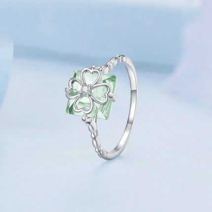 Grüner vierblättriger Kleeblattring aus Sterlingsilber S925, weiß vergoldet