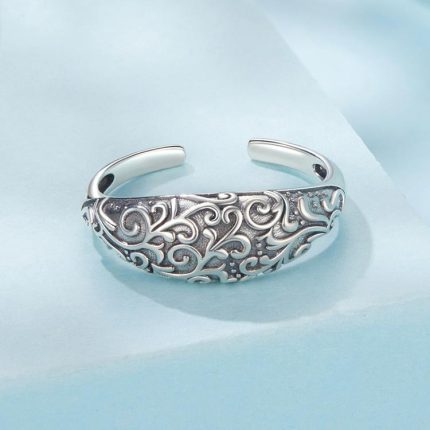 S925 Sterling Silver Oxidized Retro Pattern Open Adjustable Ring