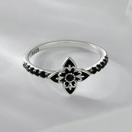 SCR1075 S925 Sterling Silber Oxidierter Retro Eleganter Schwarz-Weiß-Blumenring