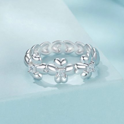 Offener verstellbarer Glücksring aus platinbeschichtetem S925 Sterlingsilber mit vierblättrigem Kleeblatt