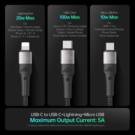 100 W 6 A Typ-C auf 8 Pin + Typ C + Micro-USB-Ladedatenkabel, 1,3 m
