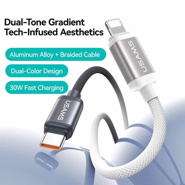 USAMS SJ757 30W Type-C to 8 Pin Dual Color Aluminum Alloy Fast Charging Data Cable