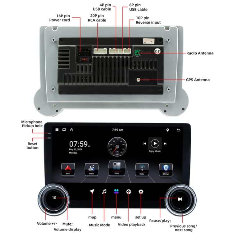 12. Videowarnung, Lenkradfernbedienung, Videoausgang, Offline-Karte, Fahrtenrekorder (USB-Signaleingang), GPS-Navigation, USB-Anschluss hinten (2-fach, USB 2.0 lesen + USB 2.0 lesen), externe Mikrofonschnittstelle, Reset-Taste
