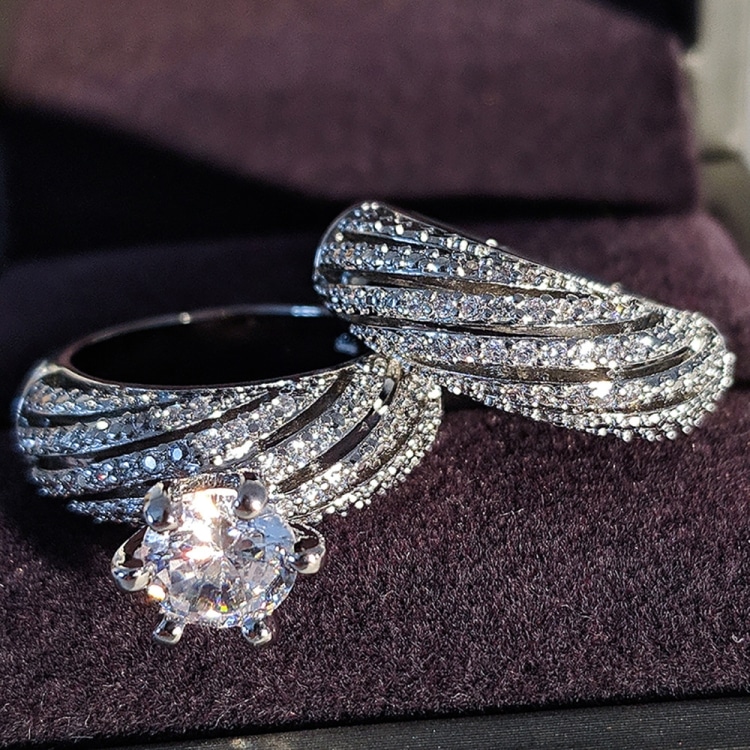 2 Stück Damen Vintage 925 Silber Diamant-Ehering