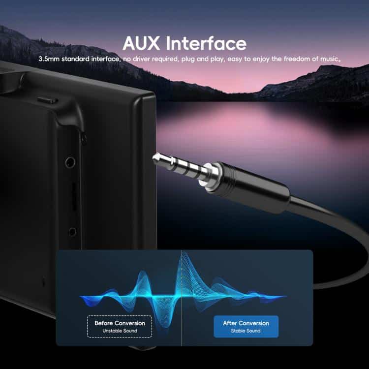 6. Unterstützt AUX-Kabelverbindung und FM-Transmitter: Der gesamte Ton des Players kann über ein AUX-Kabel oder einen FM-Transmitter an das Autoradio übertragen werden, sodass Sie Musik über das Autoradio hören können.