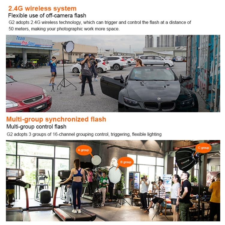 13. Drahtloses System: Das integrierte 2,4-G-Funk-G-System kann als Master- oder Slave-Einheit des drahtlosen Mehrfachlampen-Blitzsystems verwendet werden, wodurch das Aufnehmen einfach und schnell ist.