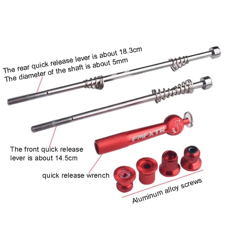 6. Größe: Die hintere Schnellfreisetzungsstange beträgt ungefähr 18,3 cm, der Durchmesser der Achse beträgt ungefähr 5 mm und die vordere Schnellfreisetzungsstange etwa 14,5 cm