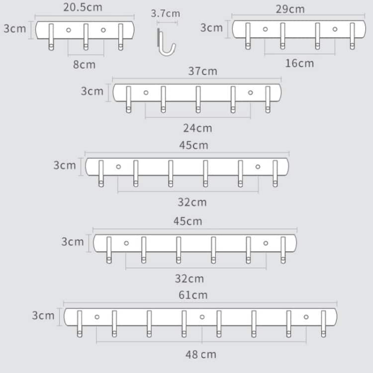 7. Größe: 3 Haken 20,5 x 3 cm, Lochabstand 8 cm;4 Haken 29×3 cm, Lochabstand 16 cm;5 Haken 37×3 cm, Lochabstand 24 cm;6 Haken 45×3 cm, Lochabstand 32 cm;7 Haken 53,5×3 cm, Lochabstand 40 cm;die 8 Haken sind 61×3 cm groß, der Lochabstand beträgt 48 cm;Der Schmetterlingshaken 201 ist 6 cm lang und der Lochabstand beträgt 3,5 cm