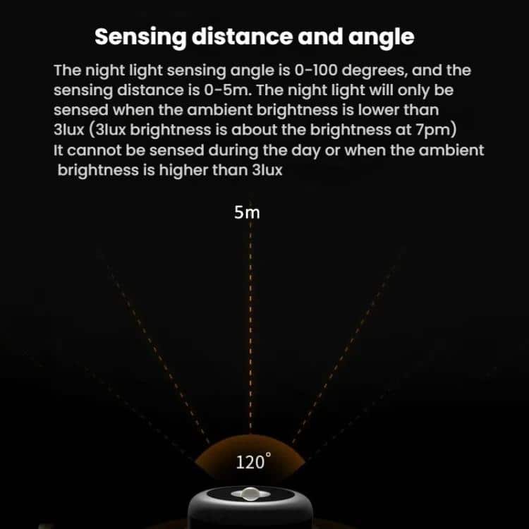 5. Sensorwinkel 0–100 Grad, Sensorentfernung 0–5 Meter (das Nachtlicht erkennt nur, wenn die Umgebungshelligkeit unter 3 Lux liegt)