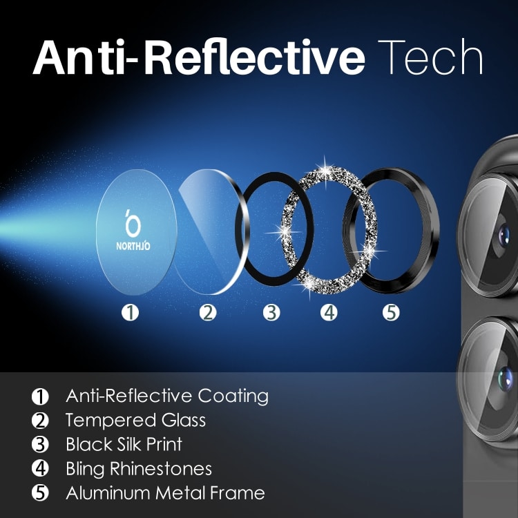 NORTHJO Glitzernder Kameraobjektivschutz aus gehärtetem Glas mit Metallring, For iPhone 16 / 16 Plus