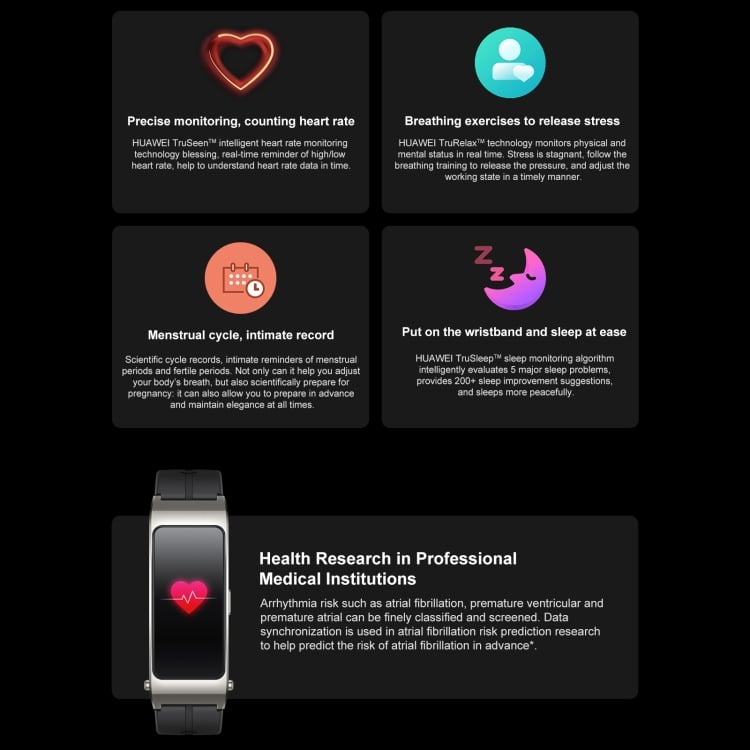 4. Was die Gesundheit betrifft, ist das Huawei TalkBand B7 mit einem PPG-Herzfrequenzmesser, einem SpO2-Sensor, einem Menstruationszyklus-Tracker sowie einem Schlaf- und Stressmonitor ausgestattet.Das tragbare Gerät ist auch in der Lage, erweiterte Herzgesundheitsparameter wie Vorhofflimmern und Schlafapnoe zu messen.Es werden 10 Sportmodi sowie VO2 Max, wissenschaftliche Laufkurse und Sitzerinnerungen unterstützt.