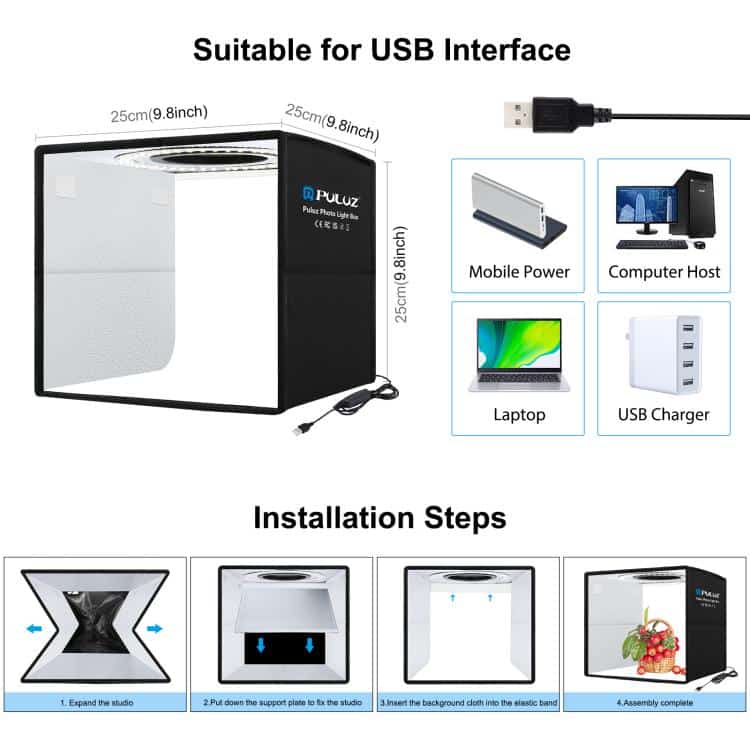 PULUZ 25 cm, faltbar, tragbar, 3 Modi, Dual-Farbtemperatur, Ringlicht, Fotobeleuchtung, Studio, Aufnahmezelt, Box mit 6 x doppelseitigen Farbhintergründen, Größe: 25 cm x 25 cm x 25 cm, 25cm 3 Color Temp. Box Black, 25cm 3 Color Temp. Box Black RU