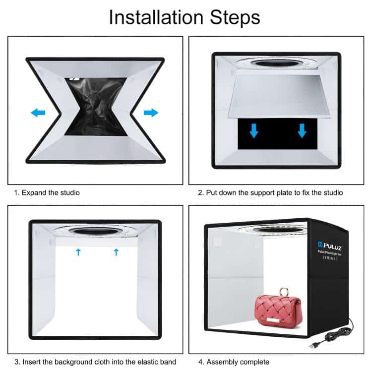 3. Einfach zusammenzubauen (in nur drei Sekunden zusammengebaut und verwendet). Sie können diese LED-Lichtbox aufklappen und auf jeder Oberfläche platzieren, um einen guten Hintergrund für die kommerzielle Fotografie kleiner Gegenstände zu erhalten und Bilder des Produkts aufzunehmen.