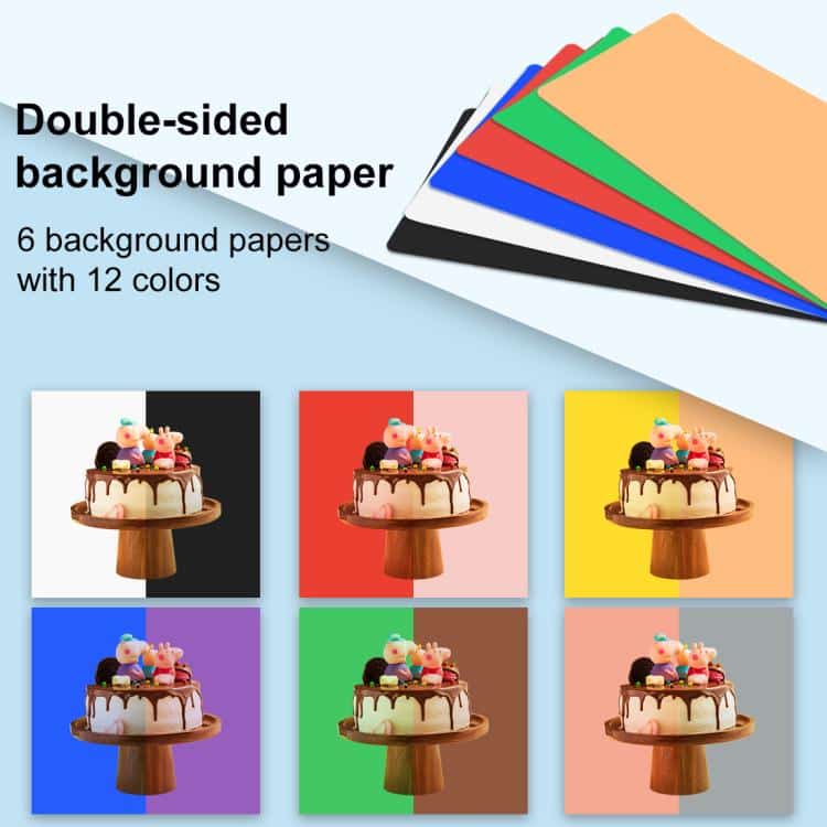 7. Mehrfarbige Hintergründe: Mit 6 abnehmbaren Hintergrundpapieren in verschiedenen Farben, beidseitig in verschiedenen Farben, insgesamt 12 Farben werden zusammen mit der Fotostudio-Leuchtbox verschickt