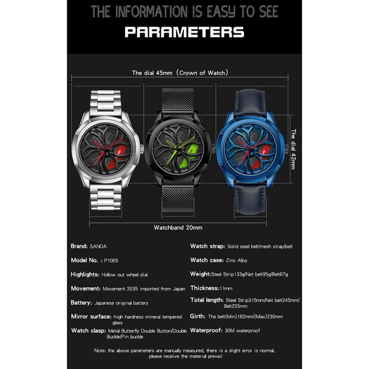 SANDA 1065 3D-Quarzuhr mit ausgehöhltem Rad und nicht drehbarem Zifferblatt für Herren