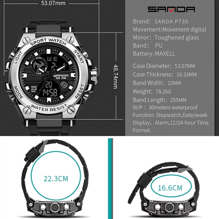 SANDA 739 Multifunktionale wasserdichte Sportuhr, Chronograph, Kalender, Alarm, Nachtlicht