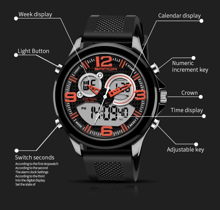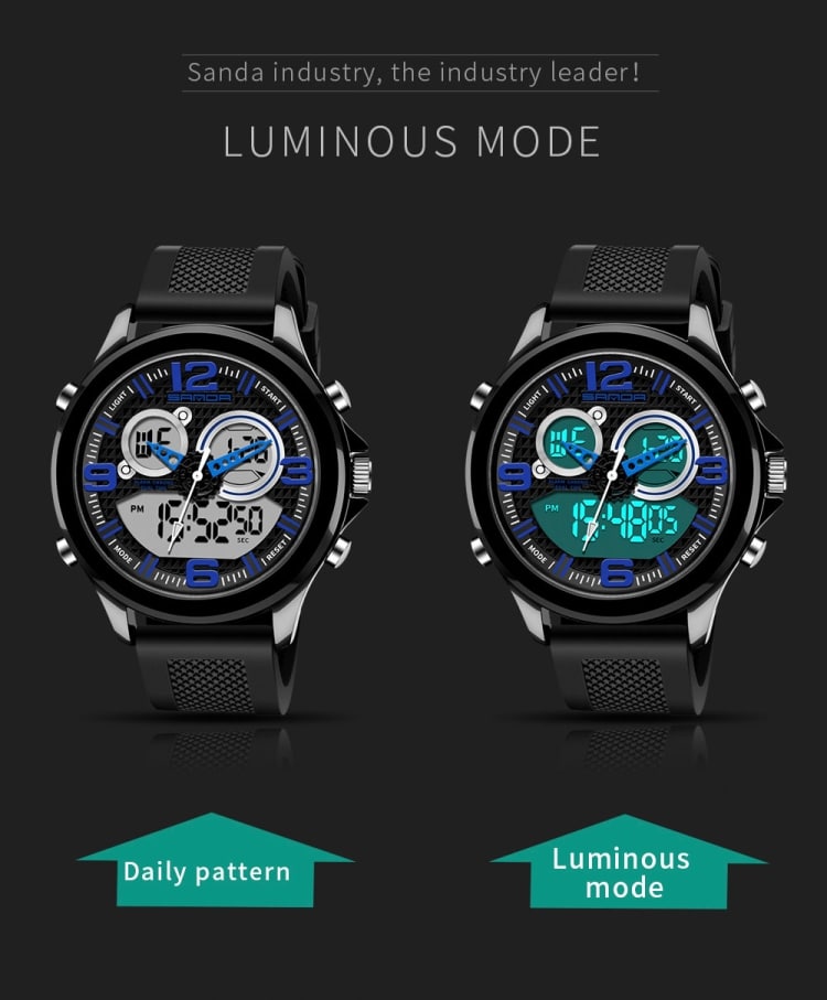 SANDA 793 Gezeitenuhr mit großem Zifferblatt, Studenten-Modetrend, multifunktionale, doppelt leuchtende, wasserdichte elektronische Uhr