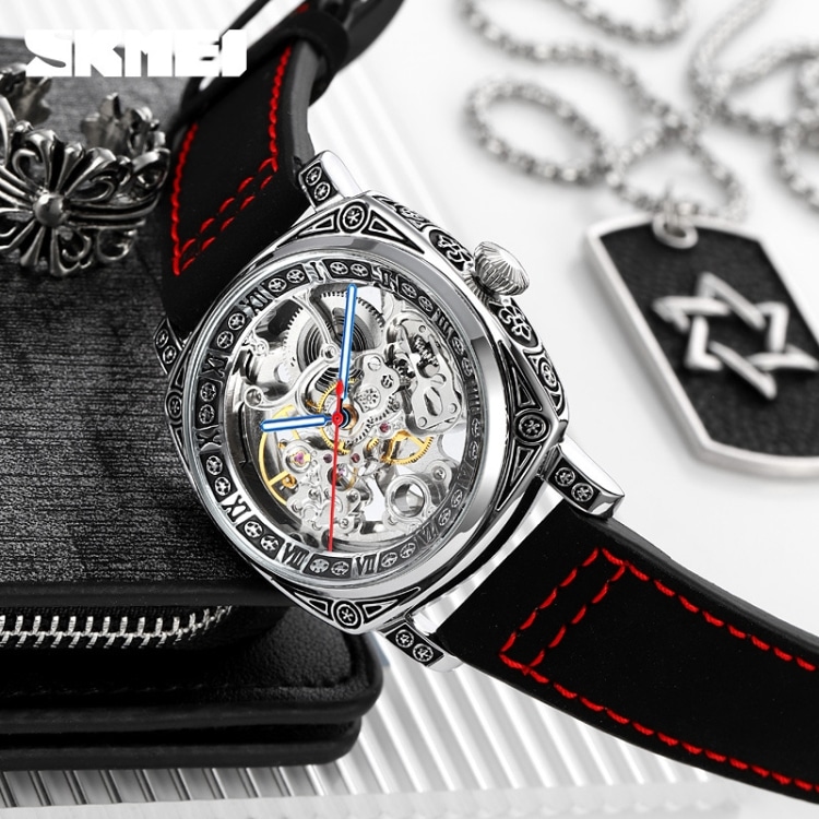 SKMEI 9271 Edelstahl-Schnalle, Lederarmband, wasserdichte mechanische Uhr