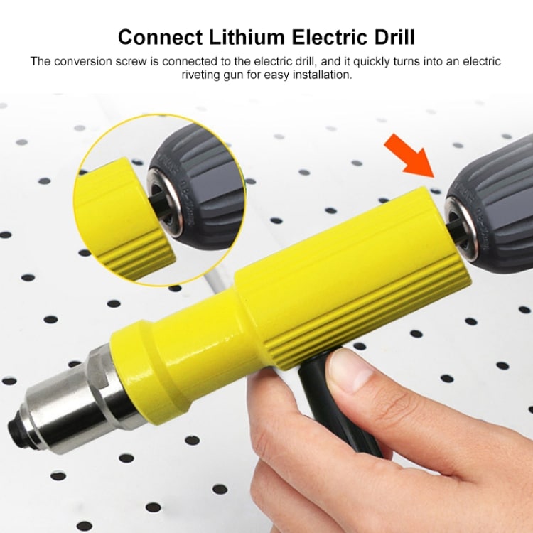 2. Drehen Sie die Bohrmaschine im Uhrzeigersinn, um das Spannfutter am Sicherungsfutter festzuklemmen. Zu diesem Zeitpunkt dreht die elektrische Bohrmaschine die Nietpistole gegen den Uhrzeigersinn, um ein Tropfengeräusch in die Niete zu erzeugen.