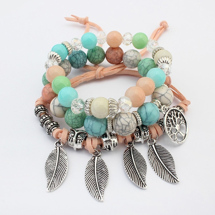 Vintage Ethnische Elastizität Marmor Perlen Armband Boho Blätter Armreif